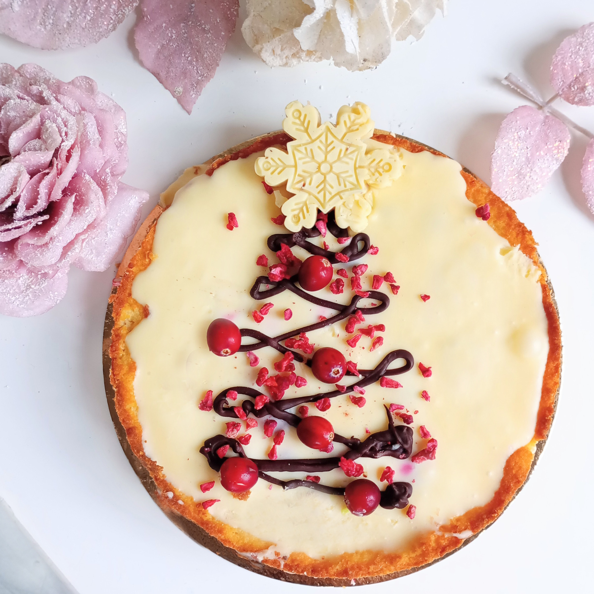 Dekorowany płatkami białej, bezcukrowej czekolady. Odpowiedni na diecie keto i dla cukrzyków.