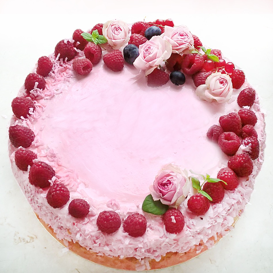 Połączenie delikatnego kremu kokosowego i orzeźwiających malin. Trzy biszkopty orkiszowo-peszenne nasączone naturalnym sokiem malinowym, przełożone kremem z sernkiem ricotta i malinami, musem malinowym oraz aksamitnym kremem kokosowym.