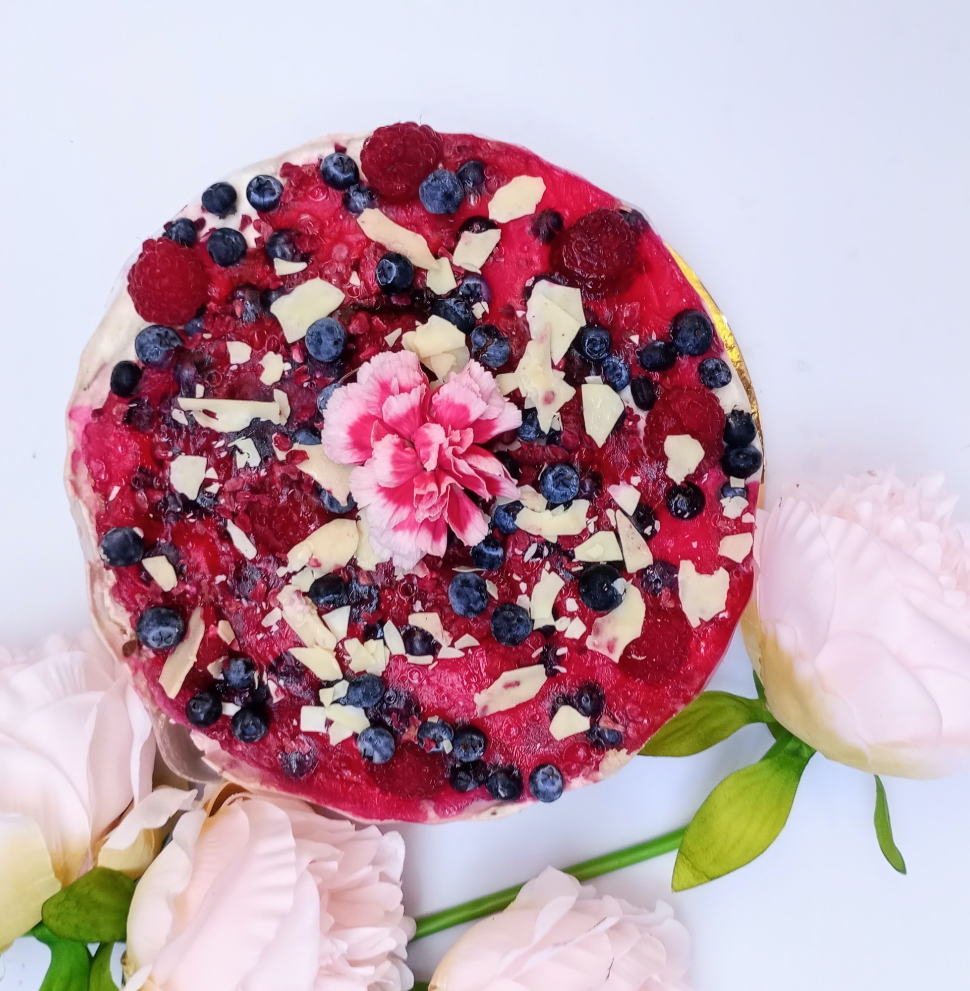 SKŁAD: twaróg, śmietana, truskawki, maliny, migdały, masło, orzechy brazylijskie, płatki migdałów, erytrytol, biała czekolada bez cukru, masło, żelatyna, stevia