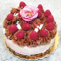 Trzy biszkopty orkiszowo-pszenne nasączone naturalnym sokiem wiśniowym przełożone kremami na bazie serka ricotta i budyniu: malinowym i śmietankowym. Do tego wiśnie, konfitura malinowa i nieco mlecznej czekolady.